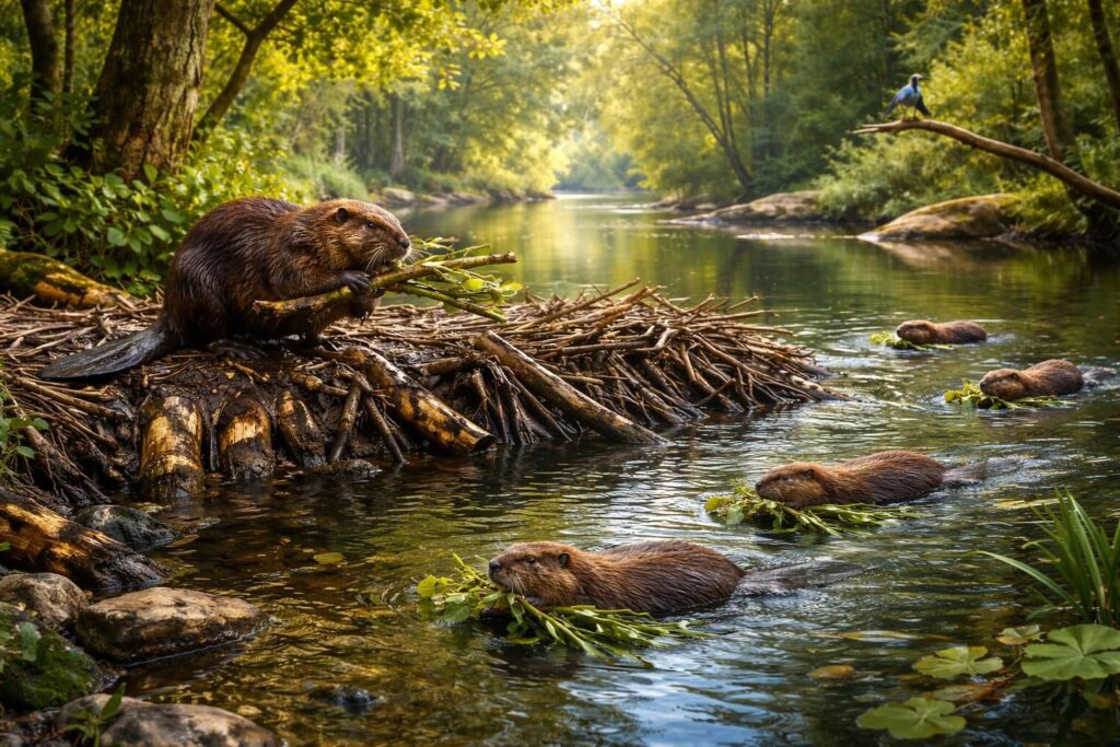 Les castors sont souvent décrits comme des architectes de l’écosystème. Leur capacité à modifier le paysage par la construction de barrages entraîne des effets positifs significatifs sur les zones environnantes. Par exemple, en ralentissant les cours d’eau, les barrages de castors permettent de reconstituer les nappes phréatiques, créant des milieux riches en biodiversité. Cela a également un impact sur le climat local, réduisant l’érosion des rivières et favorisant la végétation.